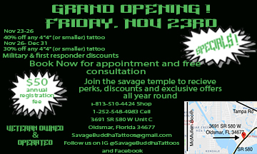 Become a member of the Savage Temple for a nominal annual fee of $50 and recieve special permanent pricing on ALL future Tattoos. Come in and ask about joining for more details.